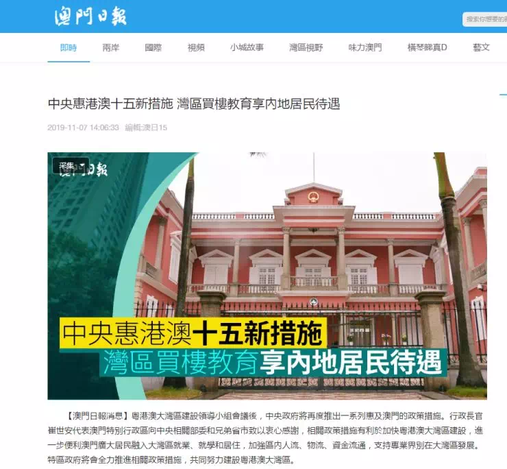 翌日,澳门也迎来一系列惠澳政策措施。其中也提到,澳门居民在粤港澳大湾区内地城市购房和教育,可与当地居民享同等待遇。