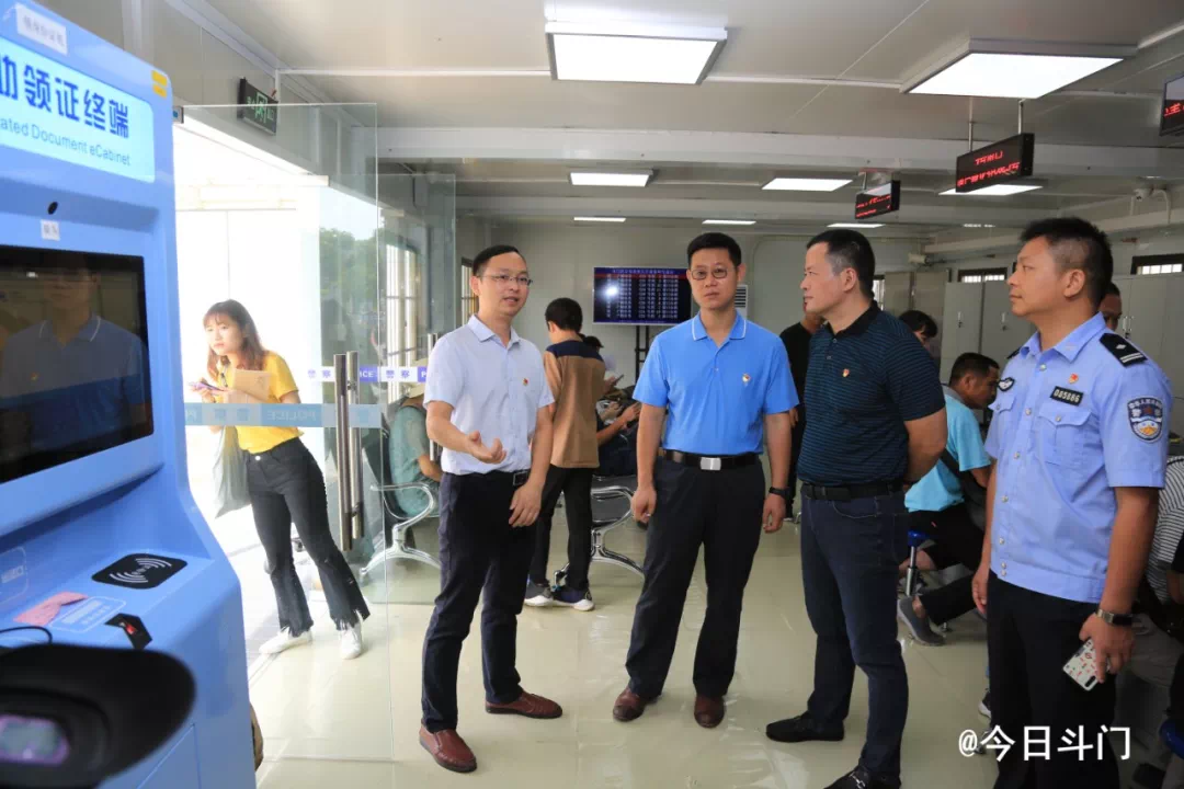 区委常委、区委区府办主任高宏伟,副区长、斗门公安分局局长朱江等领导为斗门区行政服务中心公安业务大厅揭牌,并实地考察了综合业务办理大厅、养犬登记服务室、居住证办理大厅等功能室,详细了解公安业务大厅的运作情况。