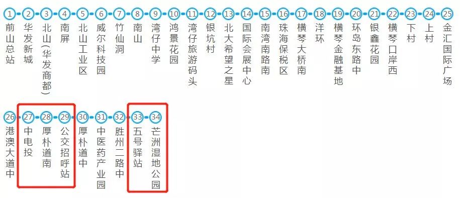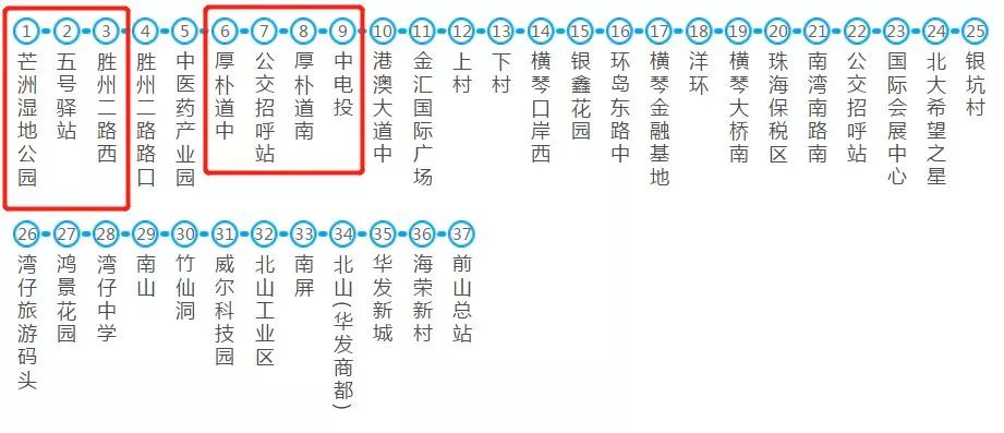 由“屏北三路西”始发后,取消临时增停的“华发水岸”,珠海大道南侧的“珠海大桥东”“均昌(奔图科技)”“广昌”“翠湾”“公交信禾物流”站。返程按原运行路线不变。