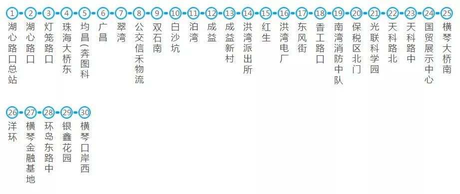 往湖心路口总站:横琴口岸西-环岛东路-横琴大桥-宝盛路-天科路-联峰路-富林西路-南琴路-珠海大道-屏东四路(下穿隧道)-屏北一路-屏工中路-珠海大道-湖心路口总站