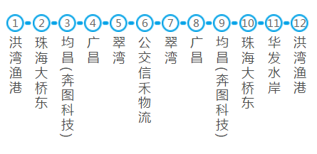 由“华发新城总站”出发,按原路线行至“广生”站,原珠海大道南侧的“珠海大桥东”、“均昌(奔图科技)”、“广昌”、“翠湾”、“公交信禾物流”站将被取消。