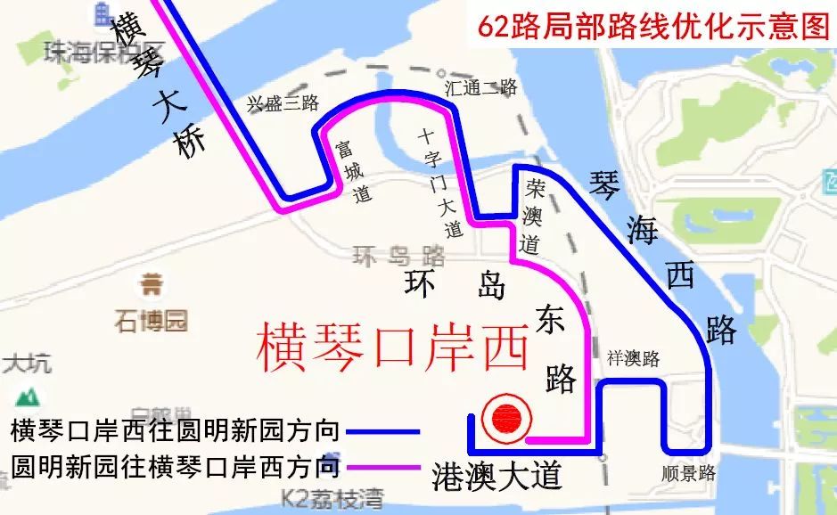 双向取消“横琴大桥南”、“洋环”、“横琴金融基地”、“环岛东路中”站,双向增停“兴盛一路口”、“海贝桥”(往横琴)、“汇通二路”、“海鸣桥”(往横琴口岸西单边经停)、“都会道”、“洋环路口”(往市区)、“兴澳路口”(往圆明新园单边经停)、“横琴口岸”(往圆明新园单边经停)。