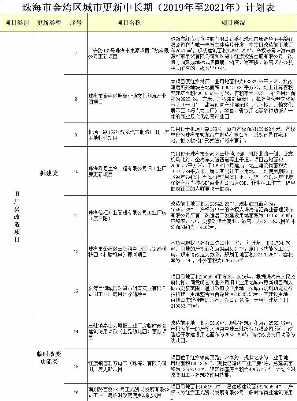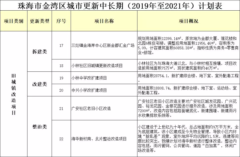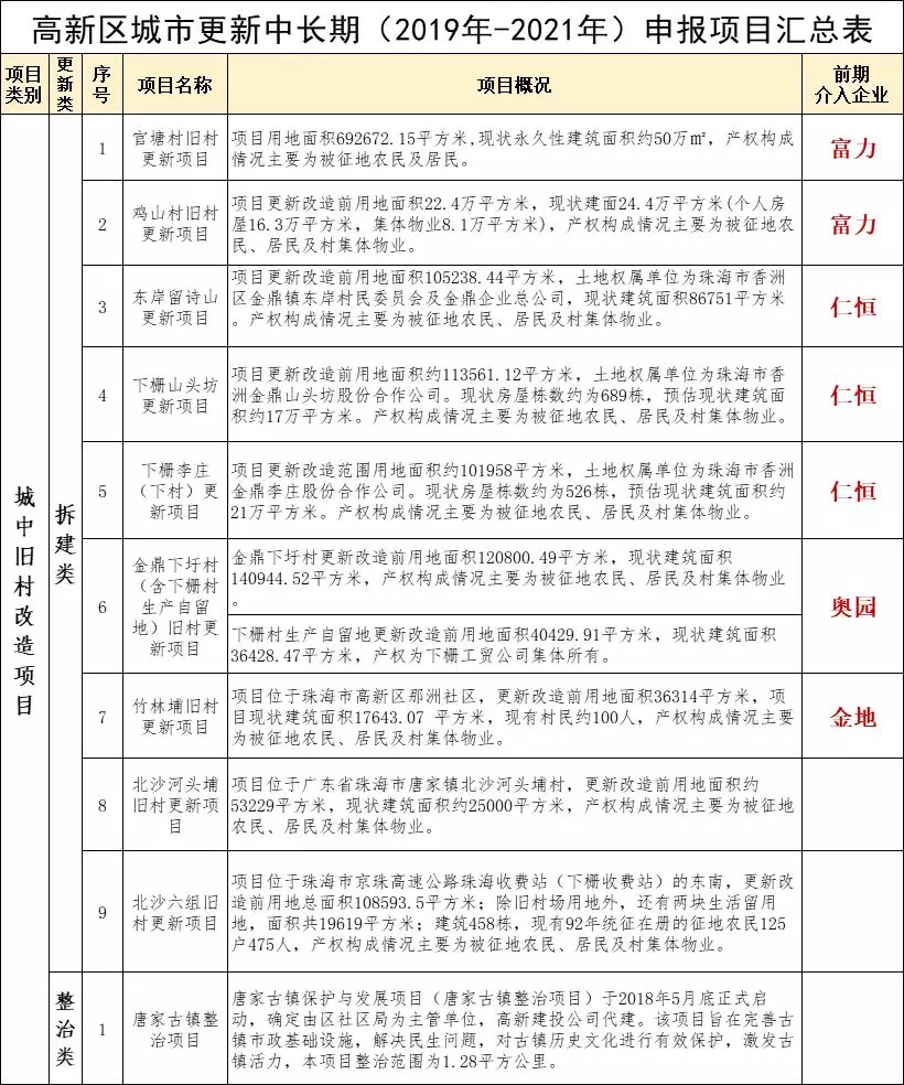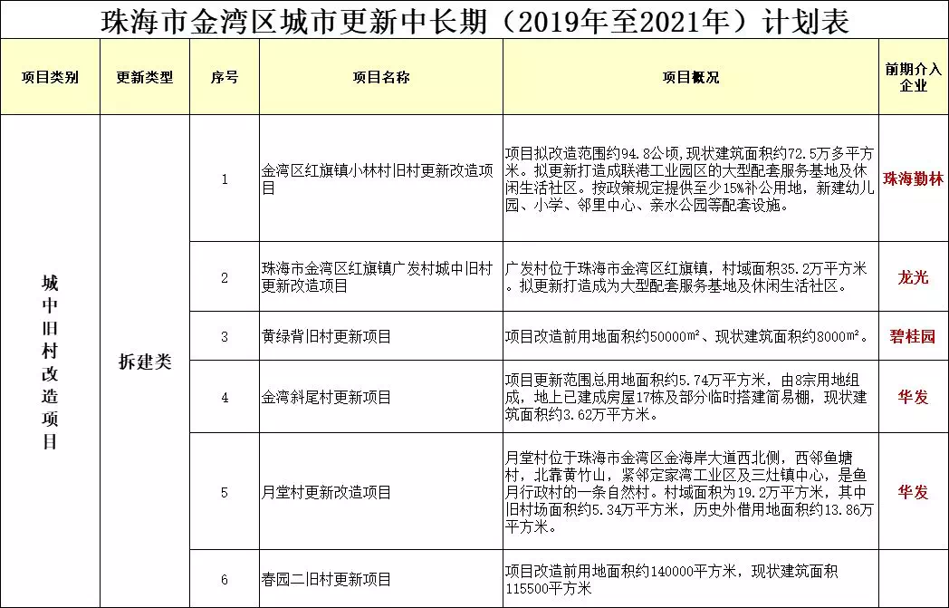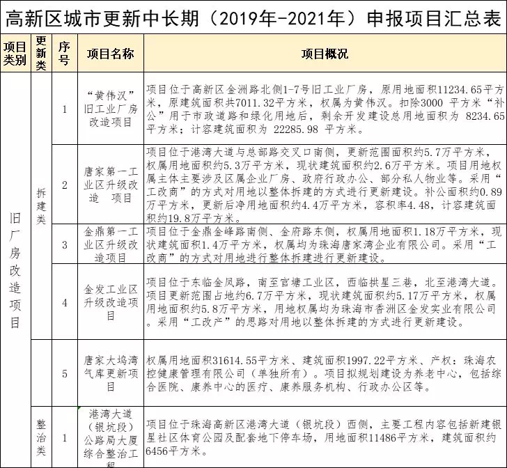 接连两天,珠海金湾区和高新区相继发布城市更新中长期(2019年至2021年)计划表,公布了旧城改造三年计划,旧村、旧厂及旧城镇改造项目一一曝光。