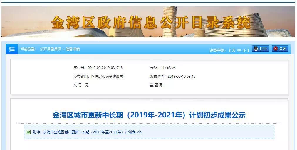 5月16日,金湾区住房和城乡建设局发布了《金湾区城市更新中长期(2019年-2021年)计划初步成果公示》。