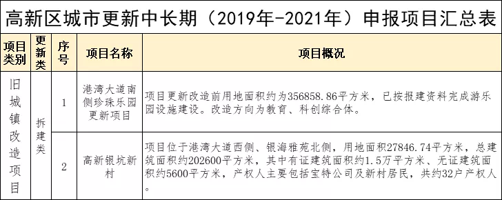 高新区2个旧城镇改造项目为,珍珠乐园和高新银坑新村。