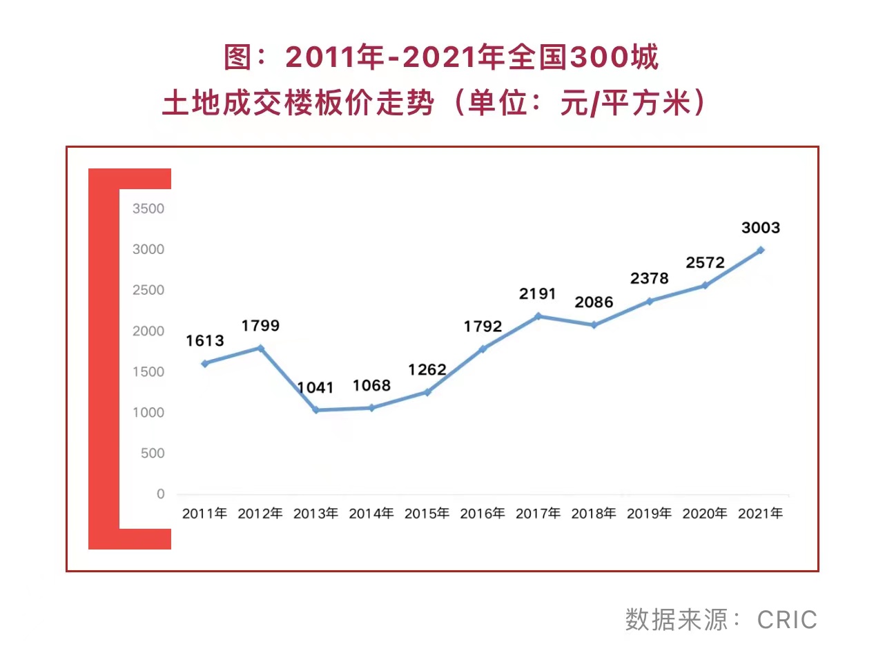具体到各城市来看。在克而瑞重点监测城市中,上海和杭州土地成交金额均突破3000亿元。杭州成交金额为3015亿元,同比大涨30%,涨幅在土地成交金额榜TOP20城市中居于首位。广州、北京和南京紧随其后,2021年土地成交总金额都超过了2000亿元。受成交结构和2021年二季度市场热度高涨的影响,2021年全国300城土地成交楼板价迎来大幅上涨至3003元/平方米,并创历史新高。从成交结构来看,一线城市2021年供地量进一步提升,成交面积占比较2020年上涨了0.7个百分点,此外,2021年二季度土地市场热度高涨,热点城市高溢价地块频出,大幅拉高平均地价。