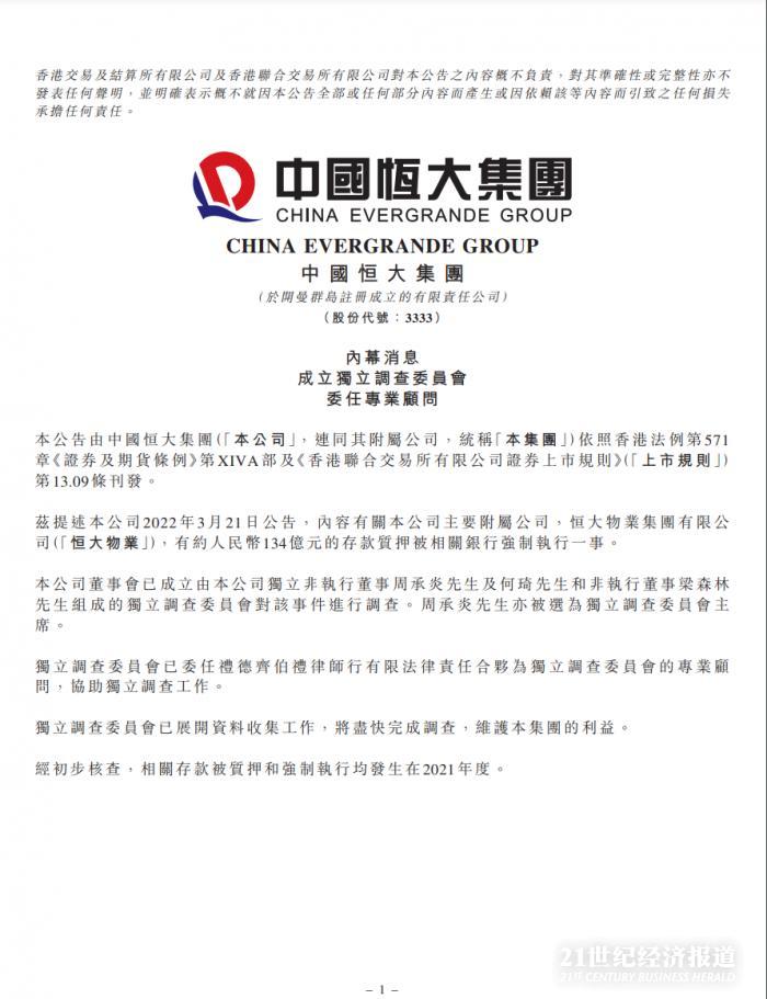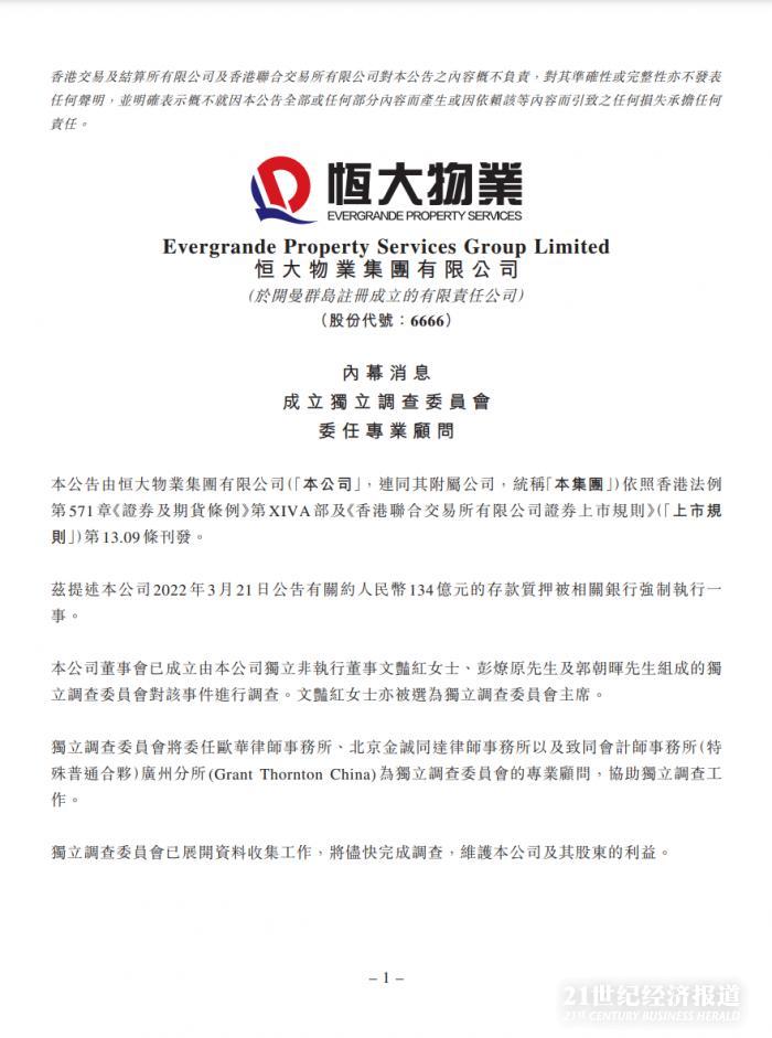 2022年3月29日,中国恒大集团(3333.HK)公告称,其董事会已成立由独立非执行董事周承炎、何琦,非执行董事梁森林组成的独立调查委员会,对该集团的主要附属公司恒大物业集团有限公司134亿元存款质押被相关银行强制执行事项进行调查。同时,恒大物业集团有限公司(6666.HK)也就相关事项发布公告。