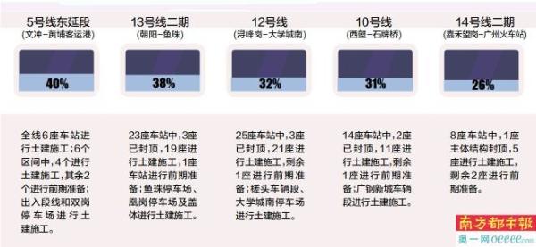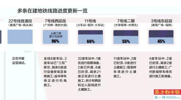 日前,广州地铁发布在建线路截至10月底的“进度条”。南都记者梳理发现,继18号线9月底实现开通运营后,其“姐妹线”22号线首通段(番禺广场-陈头岗)日前正在开展运营调试。备受关注的广佛第二条“牵手”地铁线路7号线西延段(广州南-美的大道)土建工程累计已完成96%,进度条快拉满,全力冲刺年内开通。