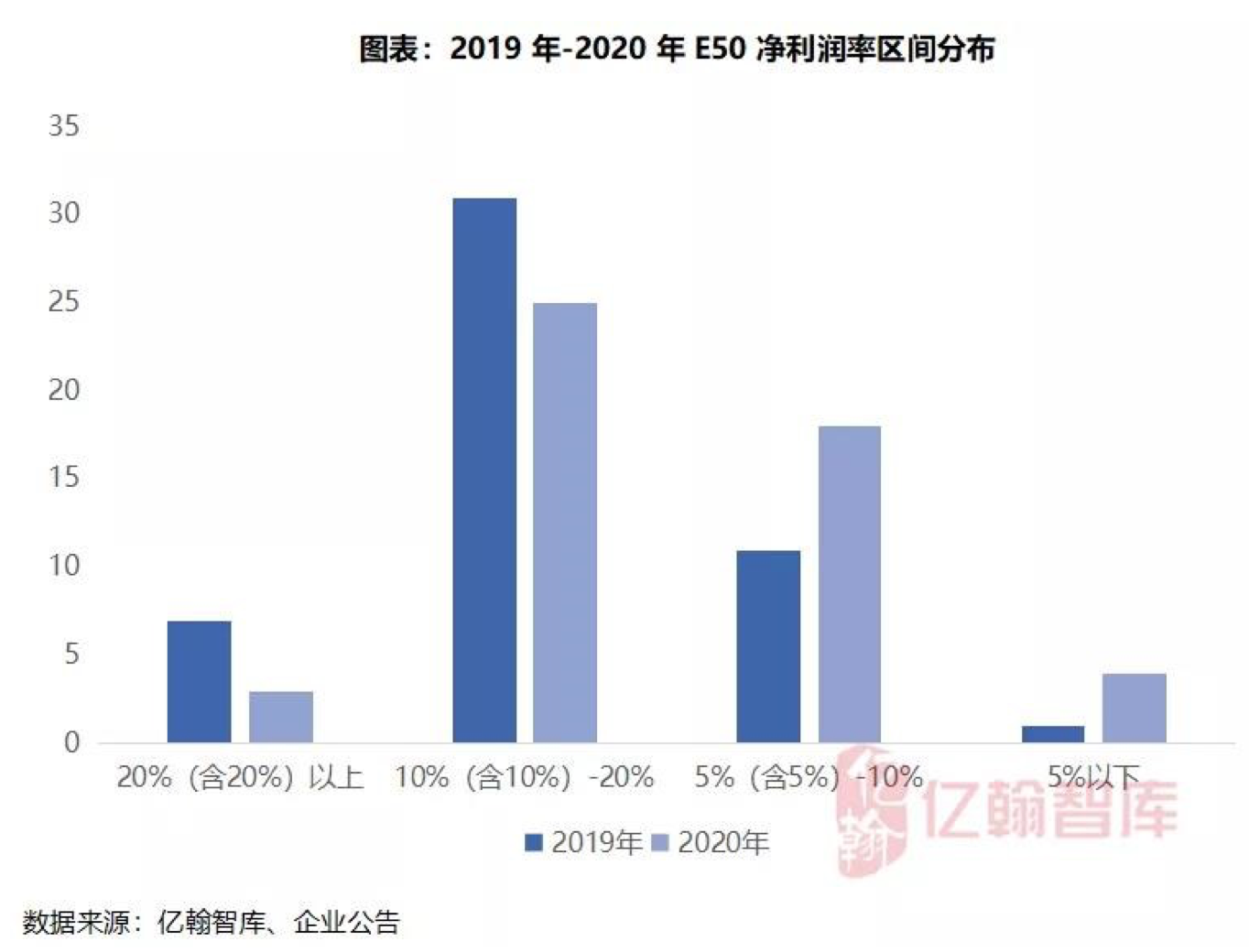 “从各区间企业数量变动情况可以看出,2020年E50房企整体净利润率下降明显,净利润率在10%以下的企业数量明显增多。”