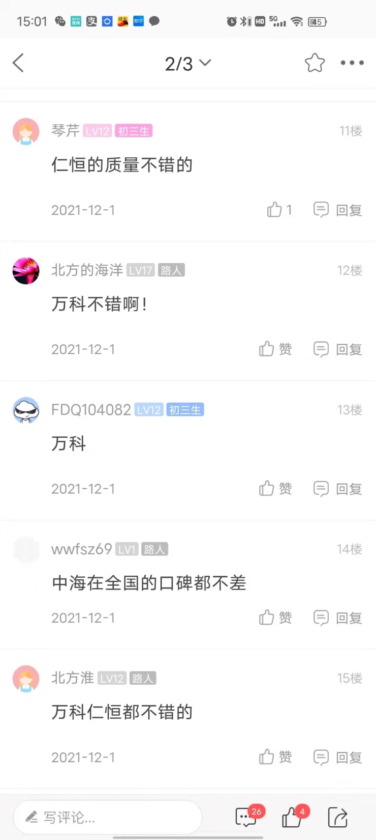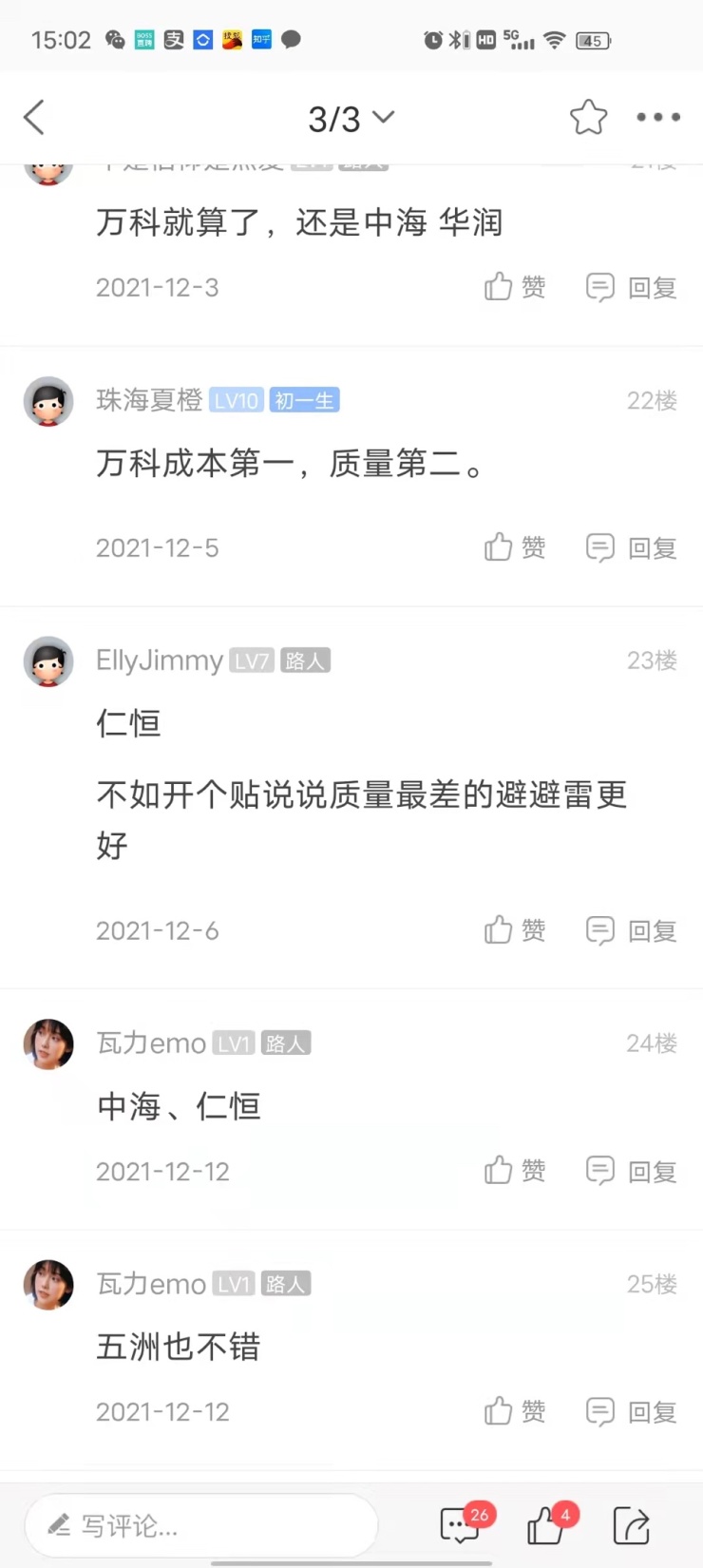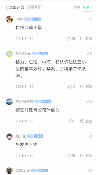 评选帖中出现较高频率的房企名字包括中海、仁恒、华发、万科等;