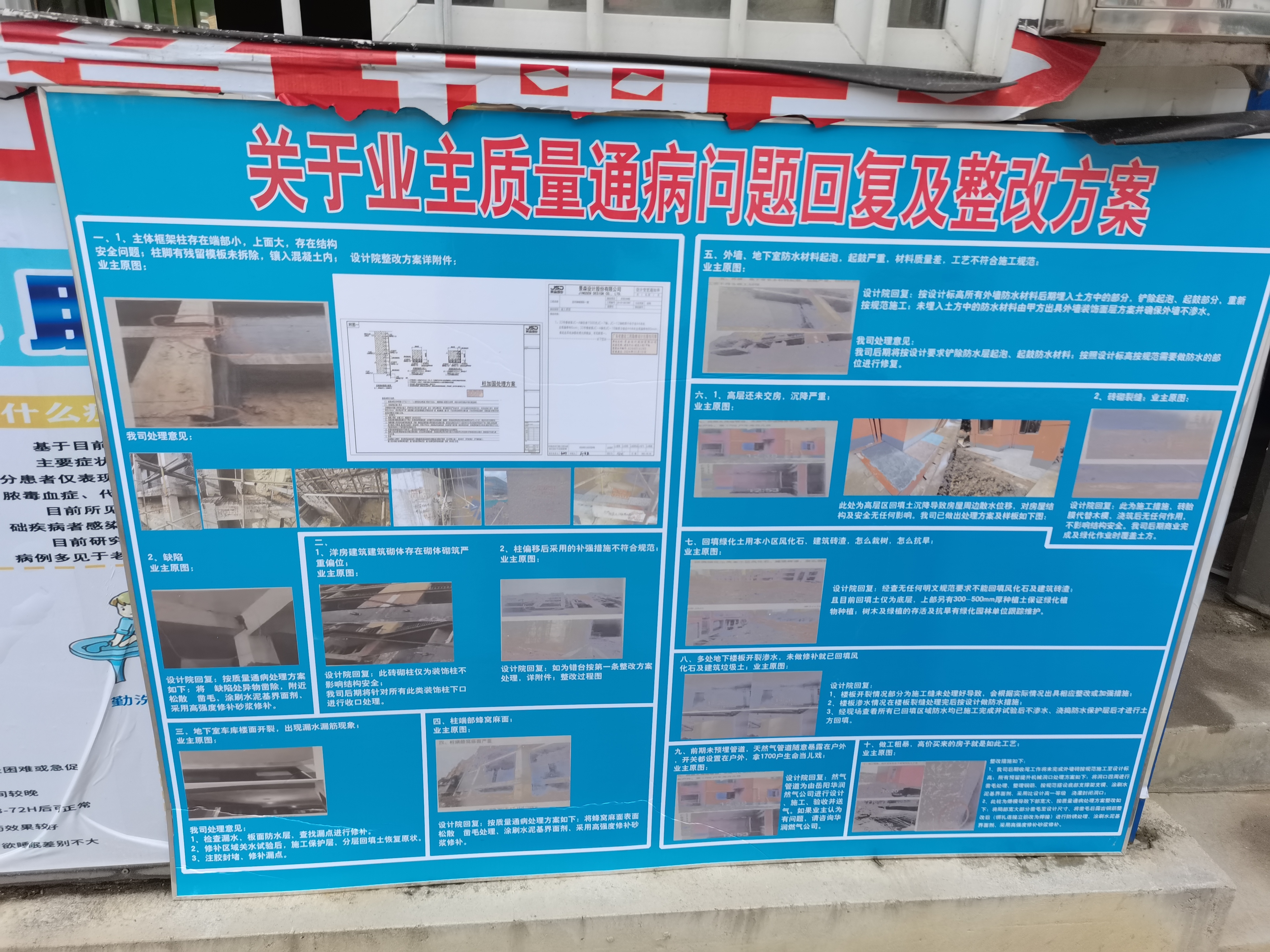 今日,针对业主反映的意见,工地现场张贴了《关于业主质量通病问题回复及整改方案》,其中对于主体框架柱问题,设计院回复称,按质量通病处理方案,将缺陷异物凿除,附近松散、凿毛,涂刷水泥基界面剂,采用高强度修补砂浆修补。