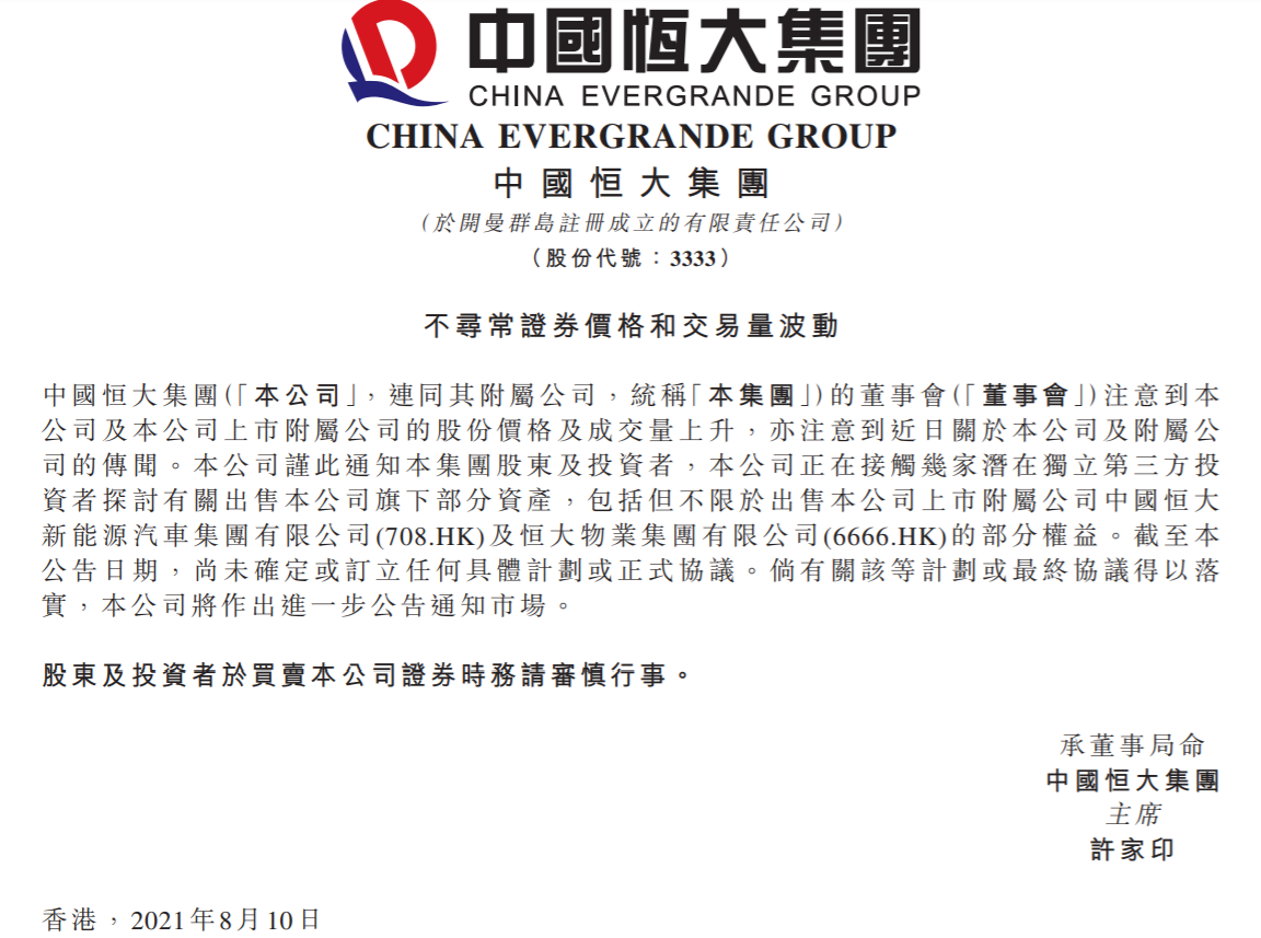 今日(8月10日)晚间,中国恒大(03333.HK)发布公告称,正在接触几家潜在独立第三方投资者探讨有关出售本公司旗下部分资产,包括但不限于出售本公司上市附属公司中国恒大新能源汽车集团有限公司(00708.HK)及恒大物业集团有限公司(06666.HK)的部分权益。