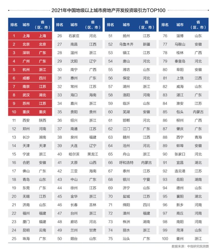 重磅发布:2021房地产开发投资吸引力城市TOP100出炉