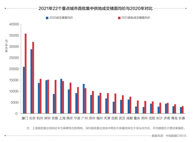 上半年22个首批集中供地的重点城市,住宅用地成交楼面价较去年全年大幅度上升。据测算,22城整体成交楼面均价9591元/平方米,同比上涨了38.3%。杭州和北京首批集中供地成交金额分别为1178亿元和1110亿元,超过2020年出让总金额的一半。