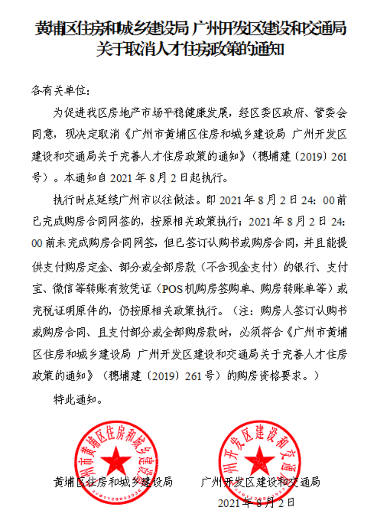 8月2日晚,广州市黄埔区住房和城乡建设局发布《关于取消人才住房政策的通知》(以下简称《通知》),成为广州排名前列明确发文取消人才购房政策的区域。