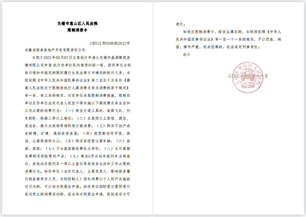 中国执行信息公开网6月17日显示,安徽省恒泰房地产开发有限责任公司(下称恒泰地产)因借款合同纠纷被列为失信被执行人,由无锡市惠山区人民法院执行。