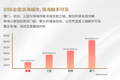 厦门、杭州、三亚与珠海同属滨海宜居之城,备受举国关注与青睐。目前,厦门、杭州、三亚三城房价已达3-5万元/㎡,而珠海作为同一梯队的宜居城市,均价为暂且处在2字头。珠海以更低的购买门槛、更大的增值空间,让世界宜居之城触手可及,置业珠海,当前正是较佳时机。