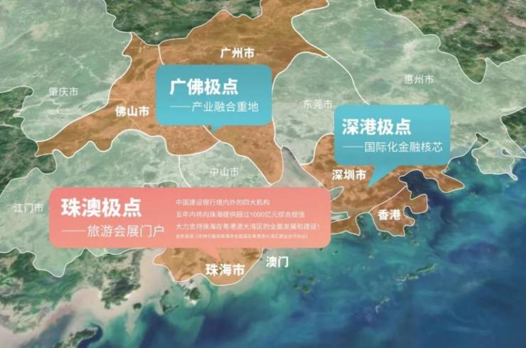 粤港澳大湾区在空间布局上,以极点带动轴带,支撑网络化空间格局。极点的带动发挥了香港-深圳、广州-佛山、澳门-珠海强强联合的引领带动作用,并深化港深、澳珠合作,加快广佛同城化建设,提升整体实力和全球影响力,引领粤港澳大湾区深度参与国际合作。珠江西岸的珠海和澳门组成的湾区三极之一,定位于旅游与会展博览中心。且澳门要建设世界旅游休闲中心,为珠海发展横琴国际休闲旅游岛提供重要基础。港珠澳大桥的建成通车,缩短了珠江口东岸城市与澳门、珠海之间的距离,为经济交流,产业融合提供了更广阔空间。