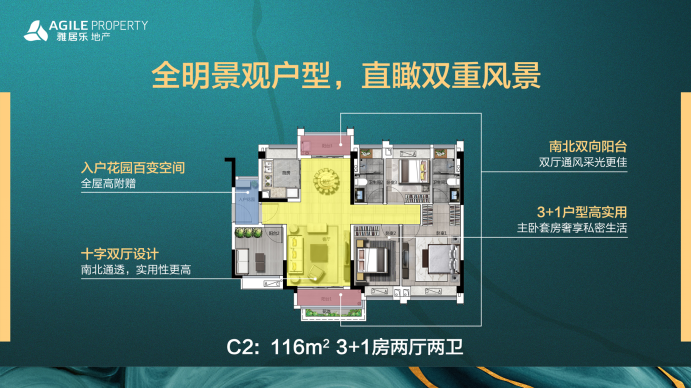 户户南向花园,推门见景;大尺度开间的客餐厅一体设计,全明采光,南北通透;南北双向观景阳台,空气流通佳;