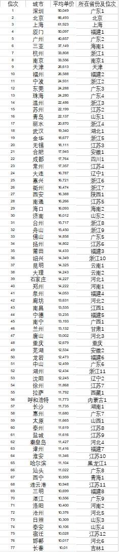 表:77个城市平均单价过万(来源:中国房价行情平台)