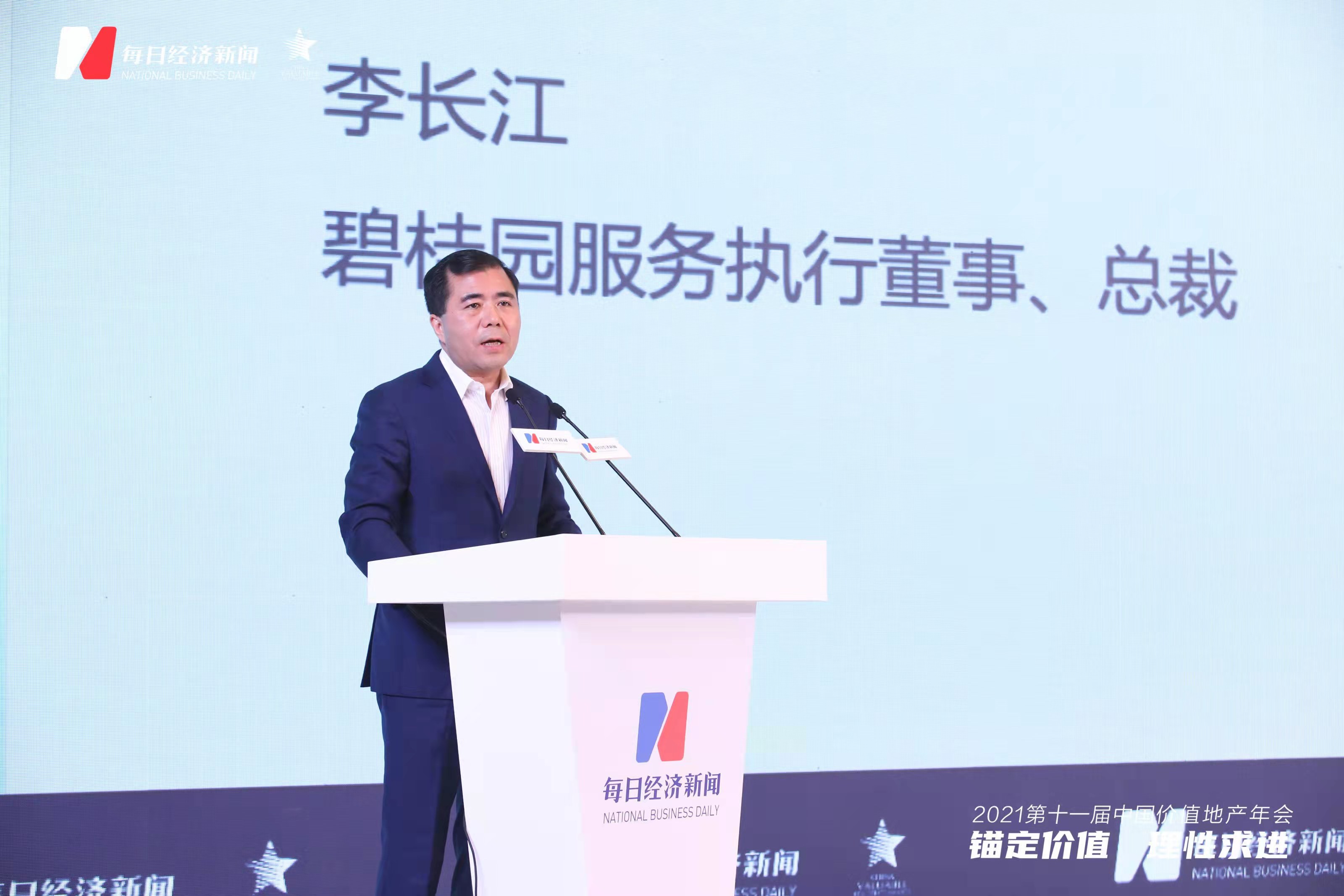 10月26日,在每日经济新闻主办的第十一届中国价值地产年会上,碧桂园服务执行董事兼总裁李长江结合年会主题“锚定价值,理性求进”,分享了一场关于“价值服务,成就服务价值”的精彩主题演讲。