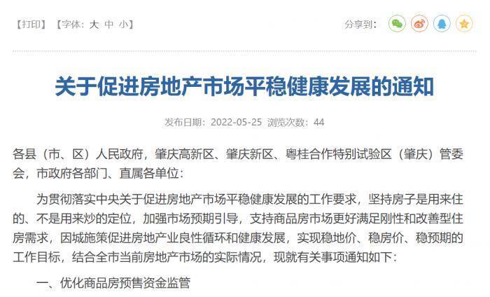 今日(5月25日),肇庆6部门联合印发《关于促进房地产市场平稳健康发展的通知》,提出优化商品房预售资金监管、加大金融支持以及提高首套住房公积金贷款上限等举措。