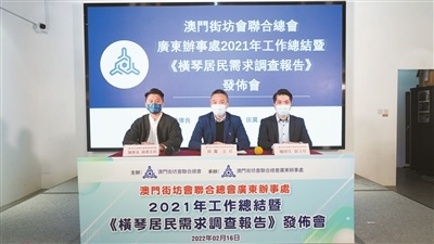 2月16日,澳门街坊会联合总会广东办事处在澳门举办2021年工作总结暨《横琴居民需求调查报告》发布会,面向澳门公众发布一年来的工作成果以及横琴居民的需求。