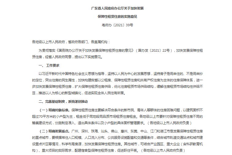 11 月 5 日,广东省人民政府网站发布《广东省人民政府办公厅关于加快发展保障性租赁住房的实施意见》 ( 简称《意见》 ) ,指出,该省各地级以上市要在年度住宅用地供应计划中单列租赁住房用地,其中,广州和深圳市单列租赁住房用地占比原则上不低于 10%。