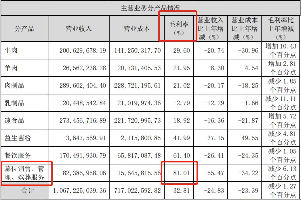 再看其2020年年报,公司墓位销售、管理、殡葬服务毛利率为81.01%,虽同比减少6.13个百分点,但仍为福成股份毛利率较高的产品。反观其他主营业务,毛利率次高的为餐饮服务,达61.40%,同比减少1.05个百分点;牛肉、羊肉、肉制品毛利率处20%-30%之间;乳制品毛利率则为-2.79%。