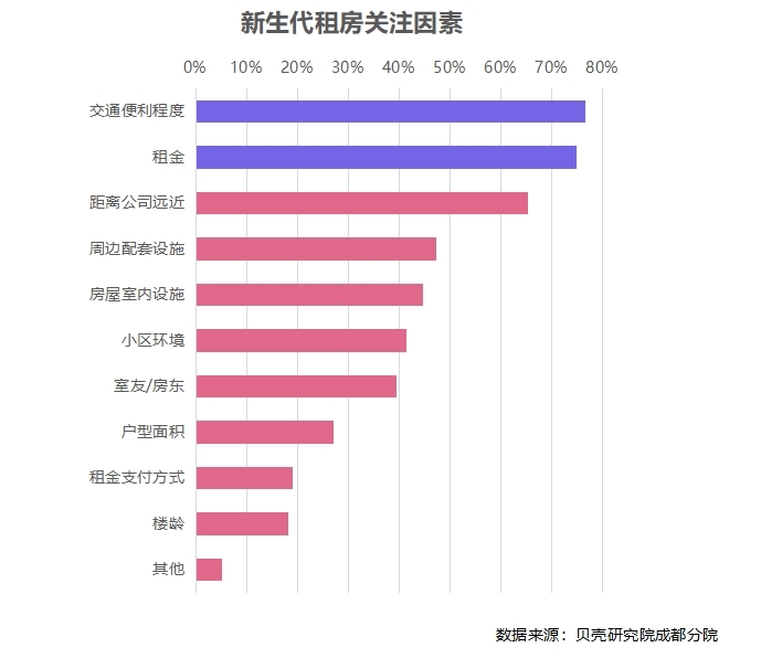 另据贝壳研究院成都分院《蓉漂新生代住房租赁报告》显示,新一线城市中,成都排名涨幅最明显,取代武汉成为毕业生优选的就业城市。而租房区位、租金是新生代最为关注的要素。其中,租房区位方面,77%的受访者希望租住在交通便利的地方;租房租金方面,75%的受访者表示可承受的租金也非常重要。