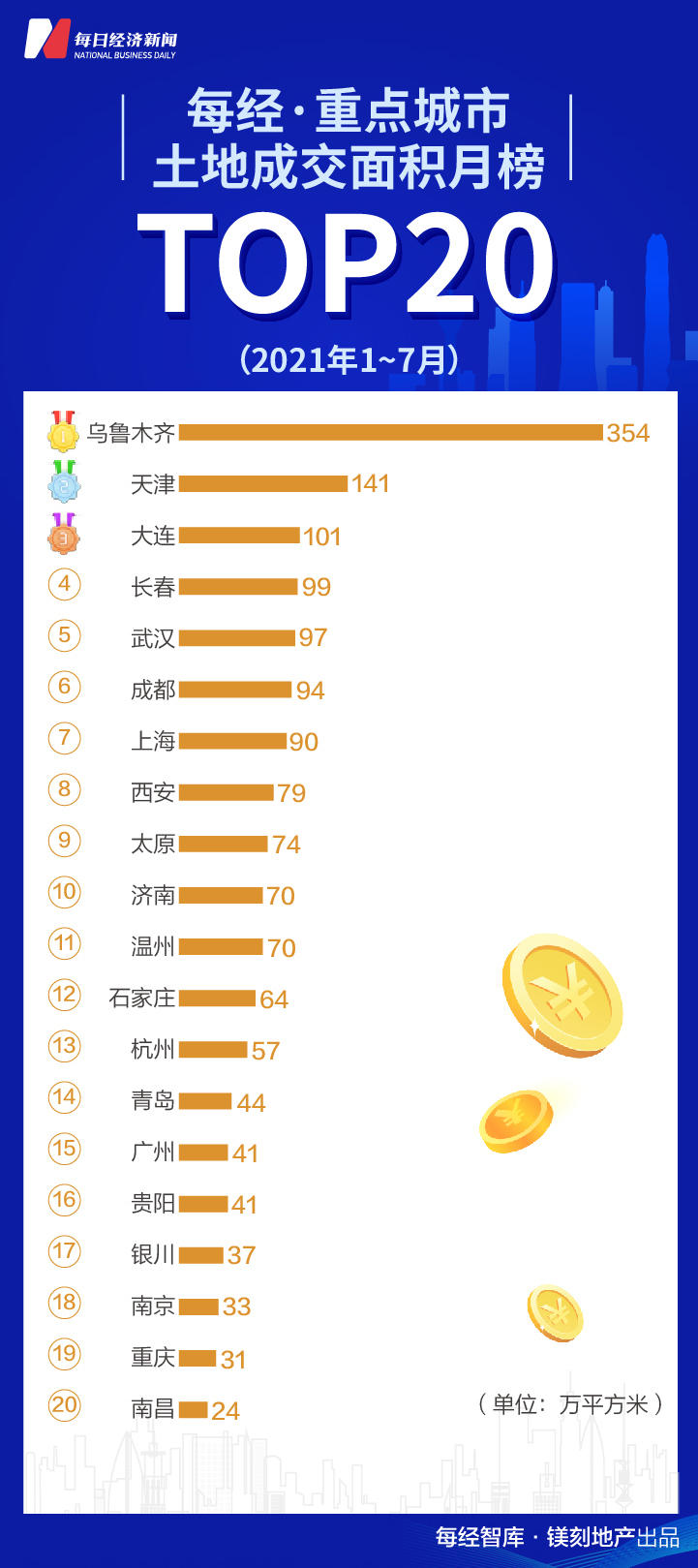 本月土地成交面积前三甲城市分别是乌鲁木齐、天津、大连,其余城市成交均未突破100万平方米。