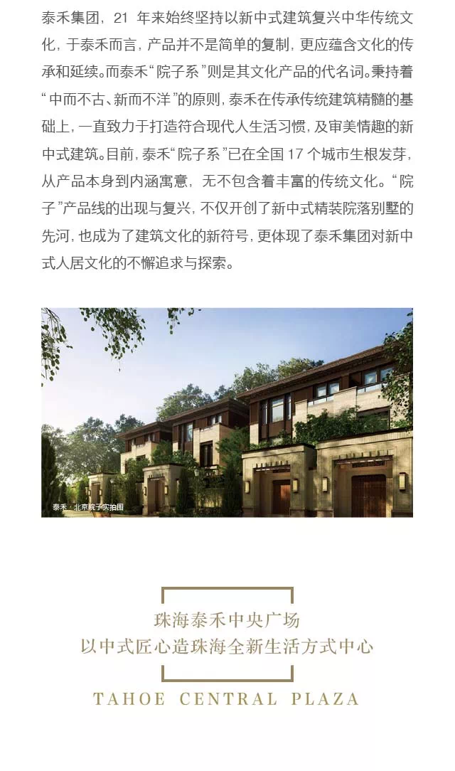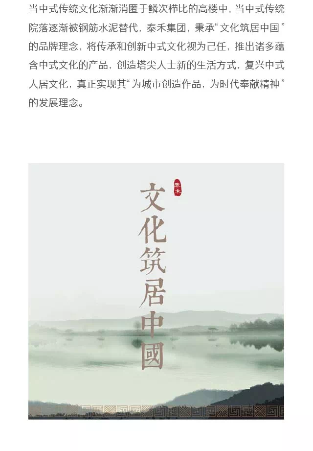 当中式传统文化渐渐消匿于鳞次栉比的高楼中,当中式传统院落逐渐被钢筋水泥替代,泰禾集团,将传承和创新中式文化视为己任。