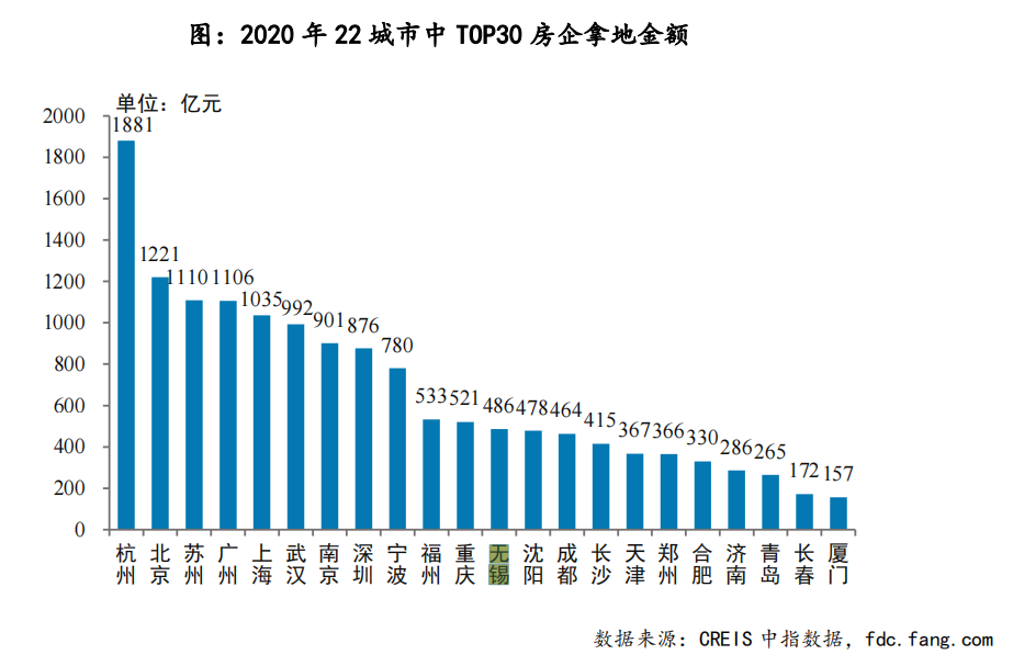 根据中指研究院统计,在2020年22城TOP30房企拿地金额排行中,无锡排在第12位,总金额达到486亿元。作为未来市场预期的风向标,无锡土拍在2021年持续火热。
