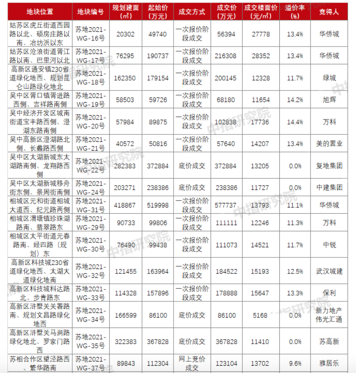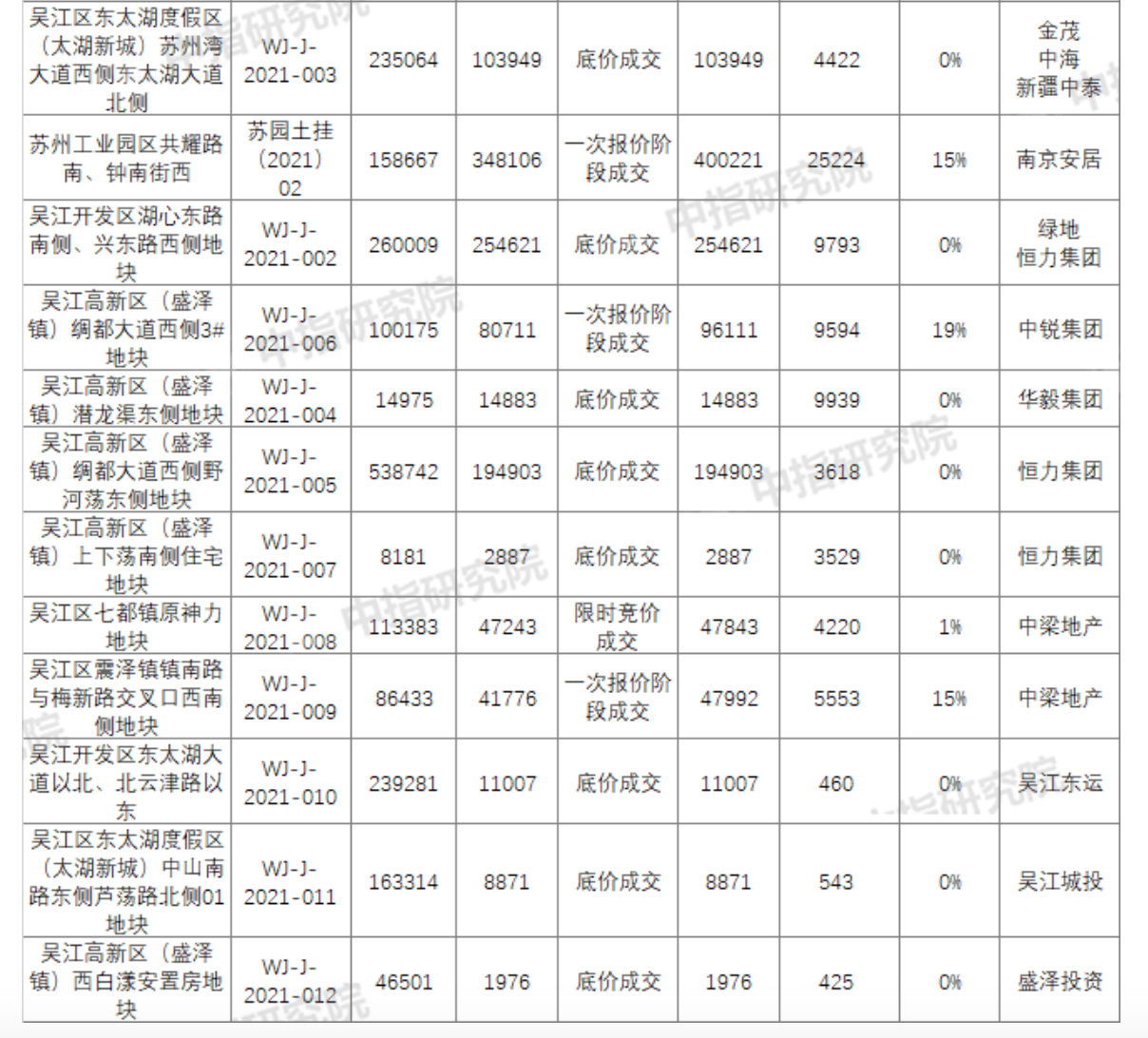 但苏州城市发展潜力巨大,为众多房企所持续看好,在苏州拿地的意愿依旧较高,共14宗宅地进入一次报价。”金珂表示。从拿地房企来看,经过3天鏖战,恒力集团拿下吴江4宗宅地,华侨城连落三子,万科、中梁、中锐各摘得2宗宅地,武汉城建首进苏城,苏高新、中海、美的、保利、绿城、雅居乐、新力、伟光汇通、中建三局、复地、绿地、金茂、南京安居等均有成功拿地。以万科为例,苏地2021-WG-20号地块经过14轮报价后触达封顶价,转入一次报价阶段,最终万科于5月31日以一次报价102838万元竞得,成交楼面17736元/平方米,溢价率14.4%。