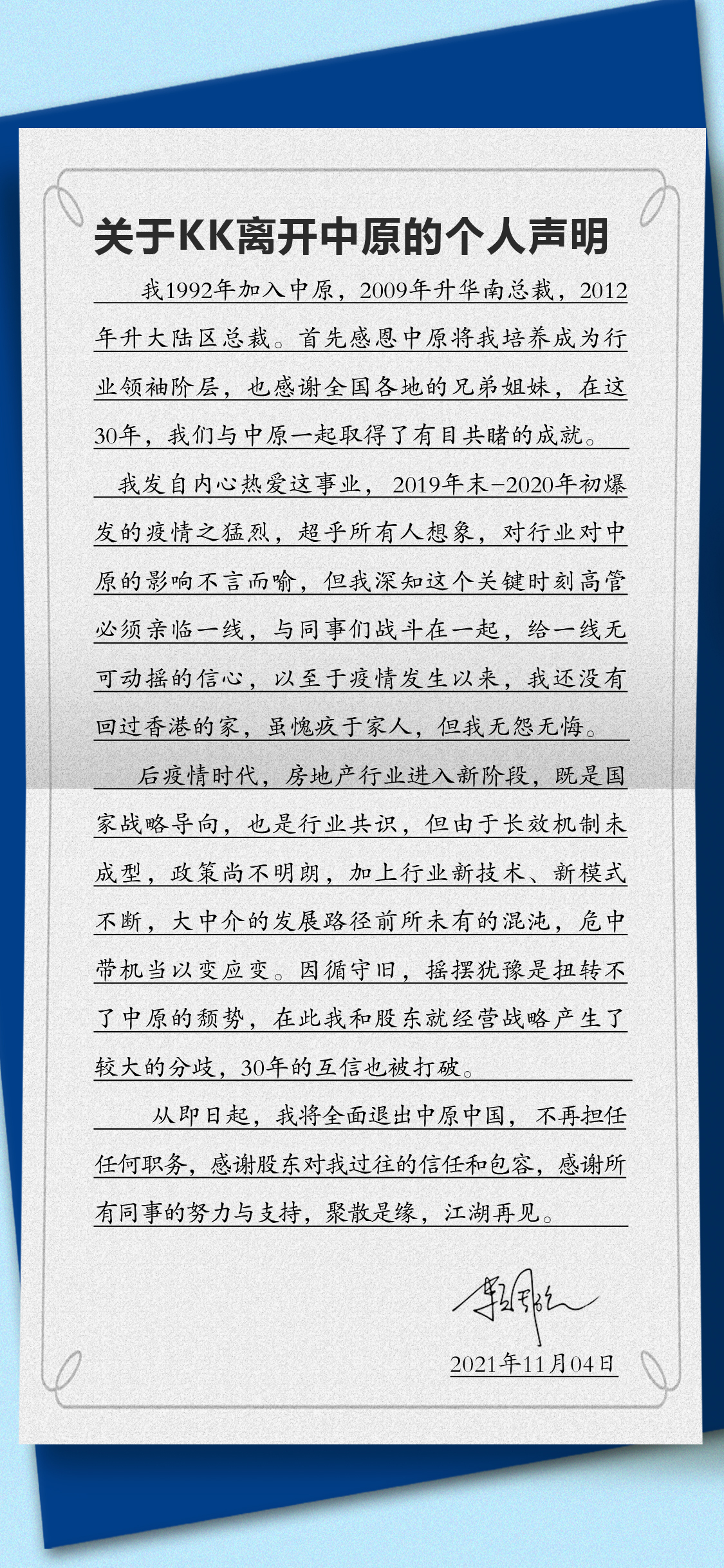 不过赖国强今日晚间发布了一份离开中原的个人声明,声明提及,后疫情时代,大中介的发展路径少有的混沌,危中带机当以变应变。因循守旧,摇摆犹豫扭转不了中原的颓势,在此我和股东就经营战略产生了较大的分歧,30年的互信也被打破。从即日起,将全面退出中原中国,不再担任任何职务。