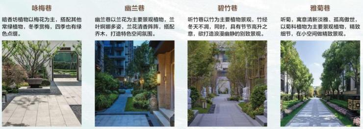 园林引入传统中式元素,在庭院雅院间布局「一轴四巷八景」景观节点,通过中轴对称的空间手法,将梅/兰/竹/菊等绿林带入园林空间,让诗意雅韵贯穿其中。匠造极具东方意境的山水栖居空间。