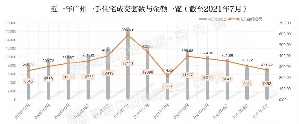 密集政策强压下,广州楼市迎来拐点。克而瑞8月6日数据显示,2021年7月广州一手住宅网签7452套,同比减少13.8%;成交面积达80.24万平方米,同比减少15.58%。