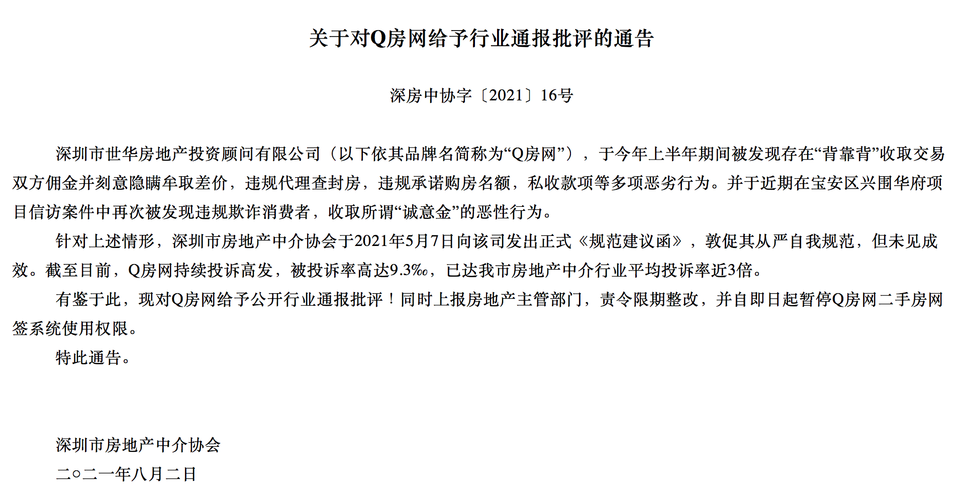 8月3日,深圳市房地产中介协会发布《关于对Q房网给予行业通报批评的通告》。
