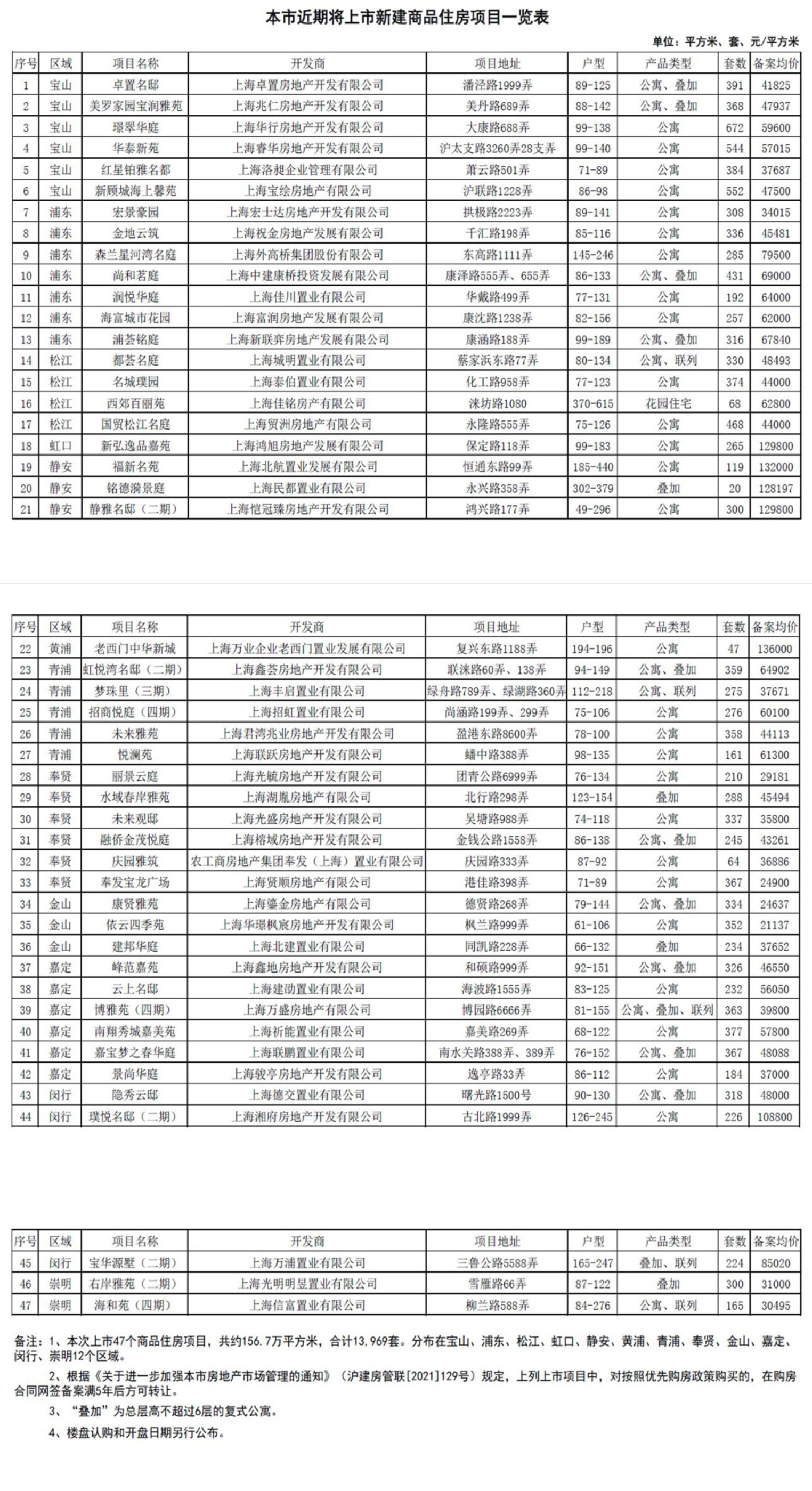 《每日经济新闻》记者了解到,本批集中上市房源包括47个楼盘项目,总面积约156.7万平方米,共计13969套房源。从项目分布看,分别位于宝山、浦东、松江、虹口、静安、黄浦、青浦、奉贤、金山、嘉定、闵行、崇明等12个区域。