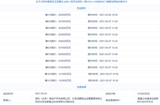 其中朝阳区王四营乡土地一级开发项目一期1304-L01地块R2二类居住用地在规定的投报时间内无人递交高标准商品住宅建设方案,根据挂牌文件规定,确定现场竞价期间竞报“公共租赁住房”面积较高者,即保利(北京)房地产开发有限公司、北京润置商业运营管理有限公司和北京金泰慧业科技有限公司联合体(保利+华润+金地)为竞得人,竞得条件为土地成交价 31.5亿元和竞建公共租赁住房面积13900平方米,成交楼面地价38911元/平方米,溢价率5%。