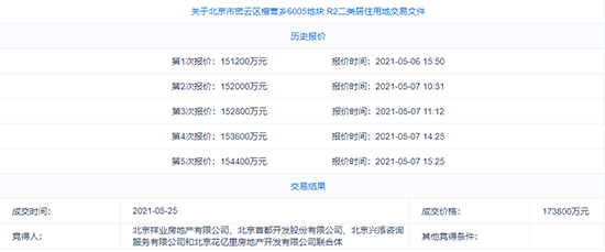 同样因无人递交方案直接成交的还有密云区檀营乡6005地块R2二类居住用地。该宗地土地面积约5.8公顷,规划建筑规模约11.7万平方米。最终由北京祥业房地产有限公司、北京首都开发股份有限公司、北京兴添咨询服务有限公司和北京花亿里房地产开发有限公司联合体(首开+住总+花样年+旭辉)以17.38亿元竞得,成交楼面地价14893元/平方米,溢价率15%。
