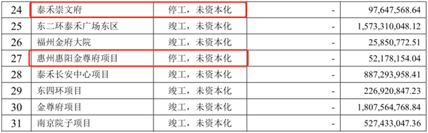 泰禾集团在回复函中列明了北京院子二期、北京金府大院、深圳院子等31个备受关注的项目利息资本化情况,其中泰禾崇文府和惠州惠阳金尊府项目是仅有的两个停工项目。