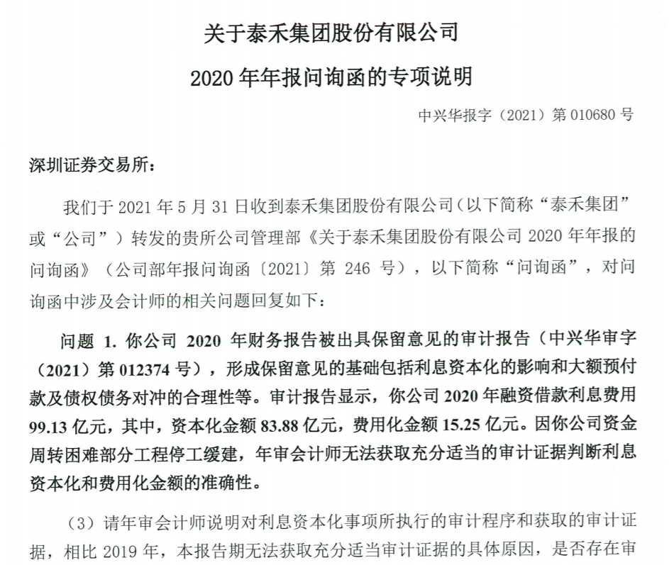 而年审会计师中兴华会计师事务所在回复函中表示,2020年年报审计时,泰禾集团因资金周转困难部分项目停工缓建,但无法提供记录停工缓建的相关资料,也无法完整提供监理月报,且部分监理公司已撤场也未配合会计师访谈问询,因此无法判断资本化事项的准确性,亦无法采取其他替代程序。