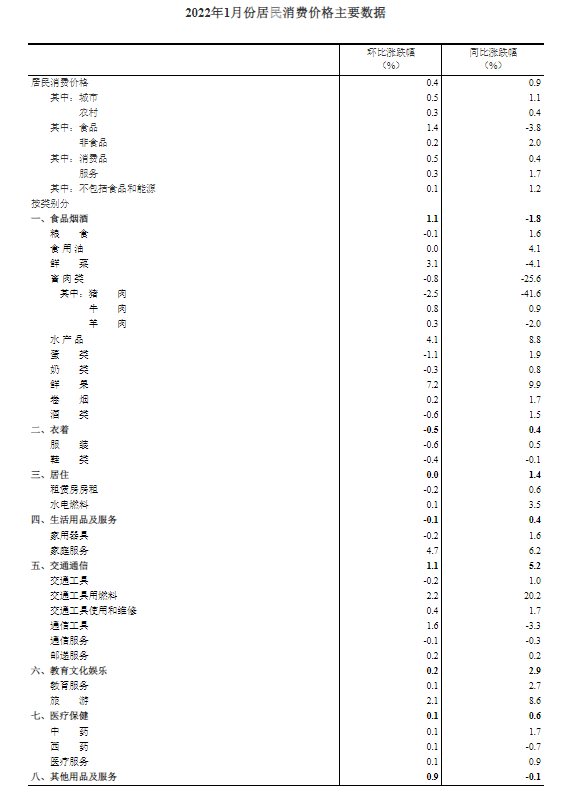 2022年1月份,全国居民消费价格同比上涨0.9%。其中,城市上涨1.1%,农村上涨0.4%;食品价格下降3.8%,非食品价格上涨2.0%;消费品价格上涨0.4%,服务价格上涨1.7%。