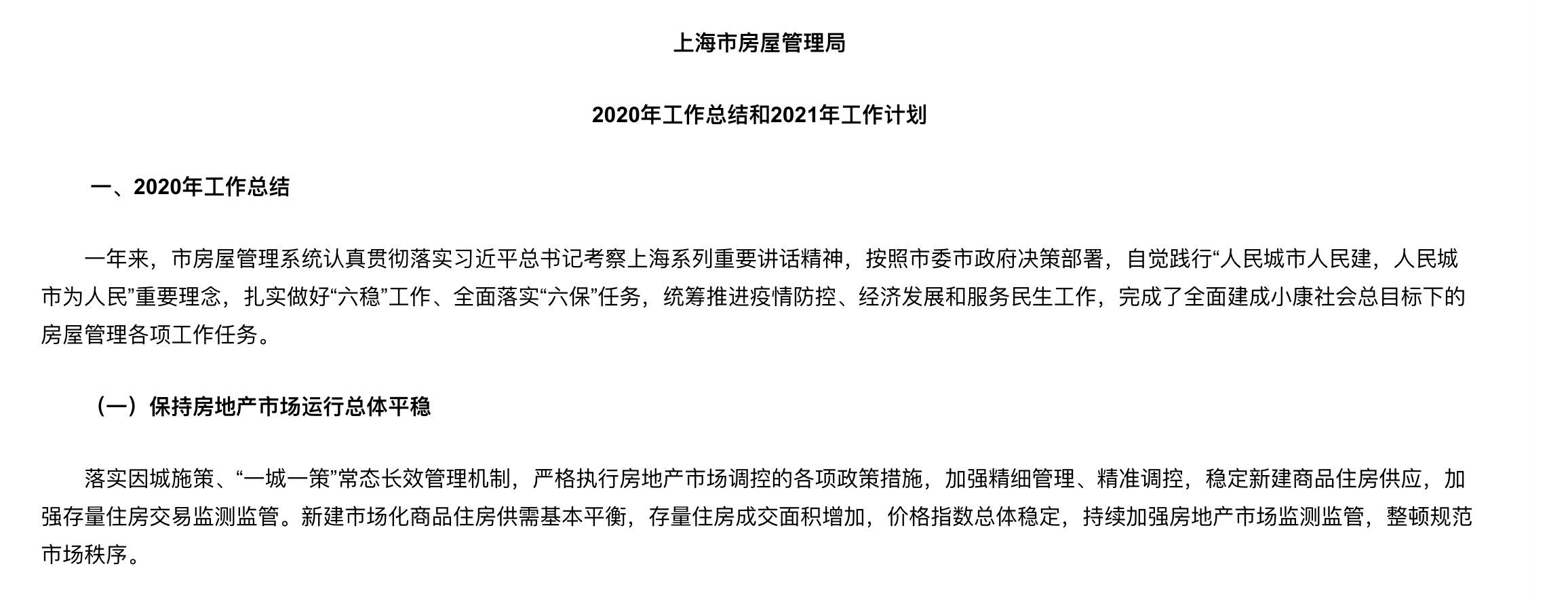 同时,深入实施《关于加快推进本市旧住房更新改造工作的若干意见》。推进旧住房更新改造1000万平方米,重点推进不成套职工住宅、小梁薄板房屋和里弄房屋改造,加大对五大新城、苏州河两岸等重点区域老旧住房的改造力度。总的来说,对做好2021年工作,上海市房管局局长王桢在4月23日召开的上海市房管局2021年系统工作会议中指出,一要坚决贯彻中央精神和市委市政府工作要求,构建超大城市租购并举住房制度体系基本框架;二要房住不炒,着力保持房地产市场平稳健康发展;三要坚持租购并举,着力解决大城市住房突出问题;四要坚持增存并重,着力提升居住品质;五要线上线下融合,着力提升住宅小区综合治理水平;六要坚持守住底线,着力防范化解各类风险隐患。
