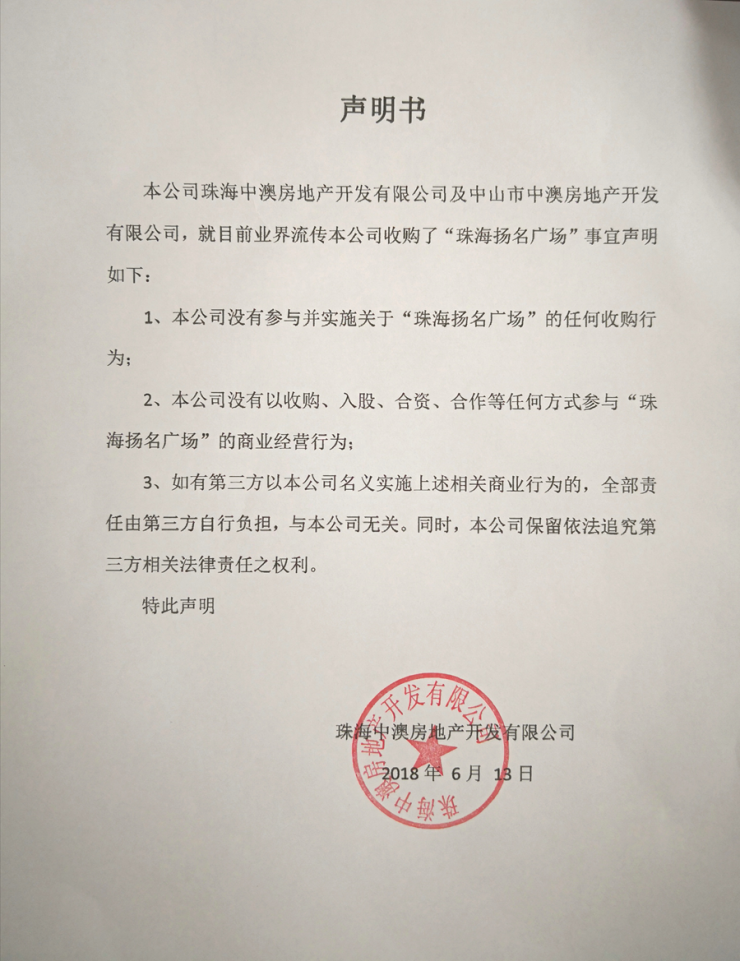 近期,坊间多有传闻珠海中澳房地产开发有限公司及中山市中澳房地产开发有限公司参与“珠海扬名广场”的收购等商业行为,6月13日,珠海中澳地产及中山中澳地产发布声明,称其公司没有参与 “珠海扬名广场”任何商业行为。