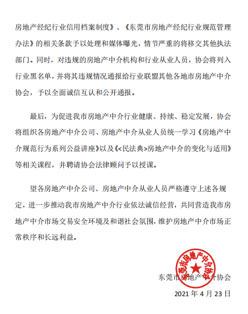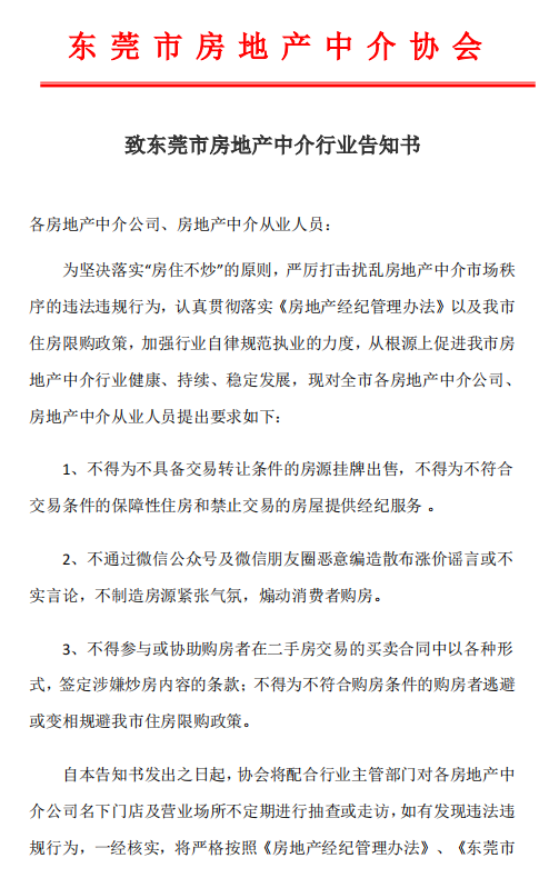 4月23日,广东省东莞市房地产中介协会发布《致东莞市房地产中介行业告知书》,要求东莞房地产中介不得为不具备交易转让条件的房源挂牌出售,不得为不符合交易条件的保障性住房和禁止交易的房屋提供经纪服务;不得通过微信公众号及微信朋友圈恶意编造散布涨价谣言或不实言论,不得制造房源紧张气氛,煽动消费者购房;不得参与或协助购房者在二手房交易的买卖合同中以各种形式,签定涉嫌炒房内容的条款;不得为不符合购房条件的购房者逃避或变相规避东莞住房限购政策等内容。