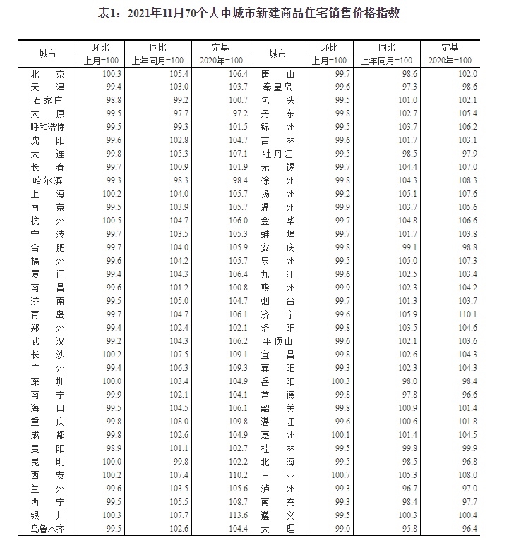 12月15日,国家统计局发布2021年11月份70个大中城市商品住宅销售价格变动情况。2021年11月份,70个大中城市商品住宅销售价格环比延续下降态势,同比涨幅持续回落。