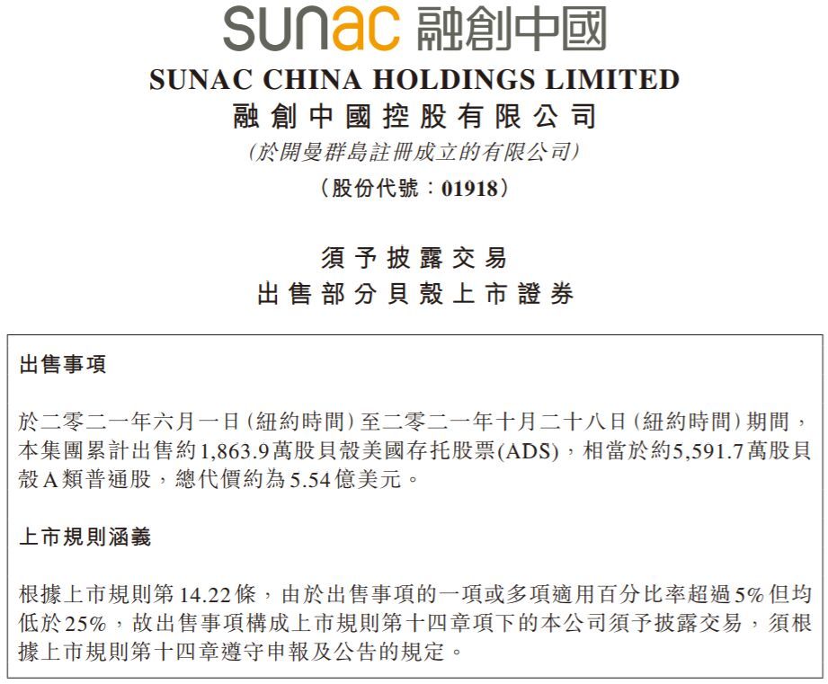 10月29日早间,融创中国(01918.HK)发布公告称,于2021年6月1日(纽约时间)至10月28日(纽约时间)期间,累计出售约1863.9万股贝壳美国存托股票(ADS),相当于约5591.7万股贝壳A类普通股,总代价约为5.54亿美元。出售之后,融创仍将持有占贝壳总股本4%的股份。