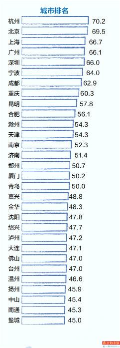 报告显示,我国城市资源配置的数字化发展水平整体上还处于初级阶段,其中达到60分及格线的,仅有杭州、北京、上海、广州、深圳、宁波、成都和重庆等8个城市,大部分城市还有较大提升空间,城市间差异性明显。